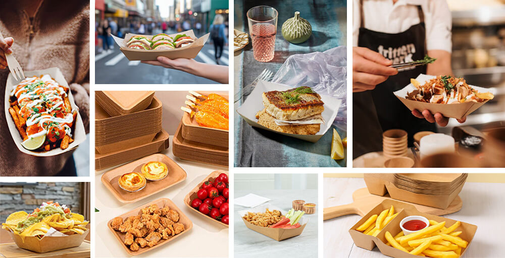 Present meals with style and convenience using our food trays — essential for plated service, catering, and takeaway packaging. Crafted from sturdy food-grade materials like molded pulp, a or paperboard, these trays keep dishes organized, prevent spills, and make transport effortless. Perfect for multi-compartment meals, buffets, or ready-to-eat offerings, food trays help portion control while showcasing food attractively. Their stackable design and moisture-resistant properties make them ideal for both hot and cold dishes, delivering functionality...
