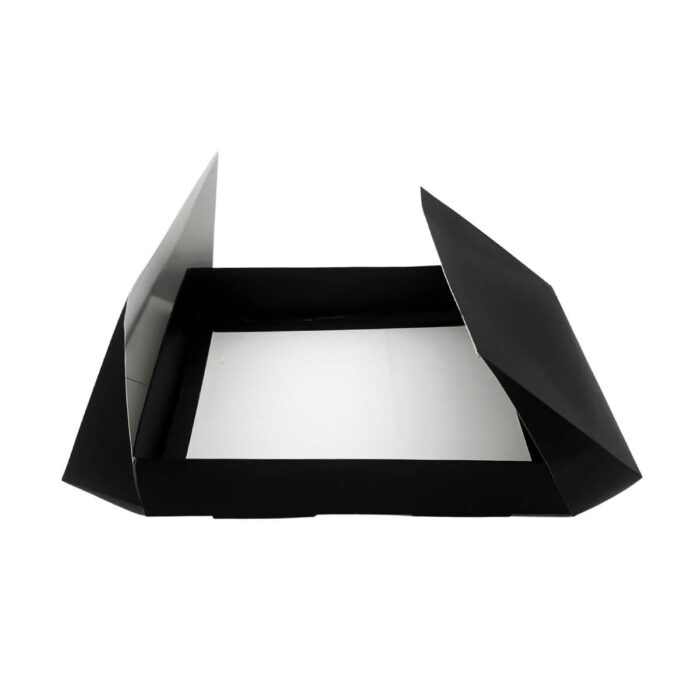Innovative black collapsible food display box with transforming design. Folds flat for storage, expands for food presentations at any venue....